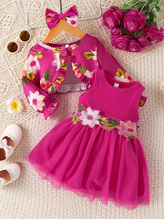 New Baby Girl Spring and Autumn Style Sleeveless Waist Flower Design Spliced Dress+Small Coat