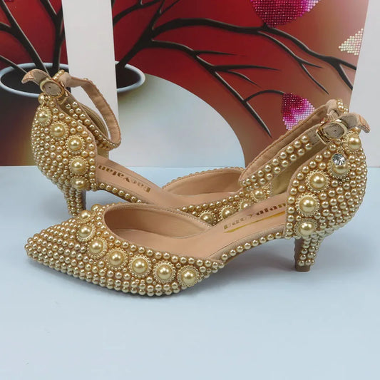 Champagne Pearl wedding Bridal shoes woman fashion Thin heel party dress shoe Lace-up Pointed Toe High Handmade Ankle Strap shoe