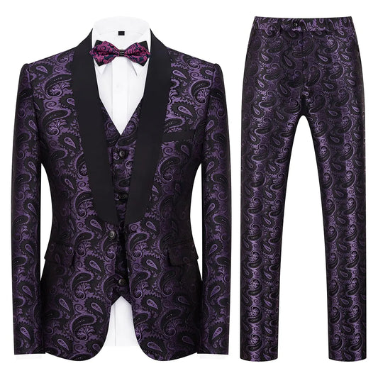 Mens Suits 3 Piece Slim Fit Tuxedo for Men Paisley Suit Prom Tux Shawl Lapel One Button Blazer Vest Pants Set Purple