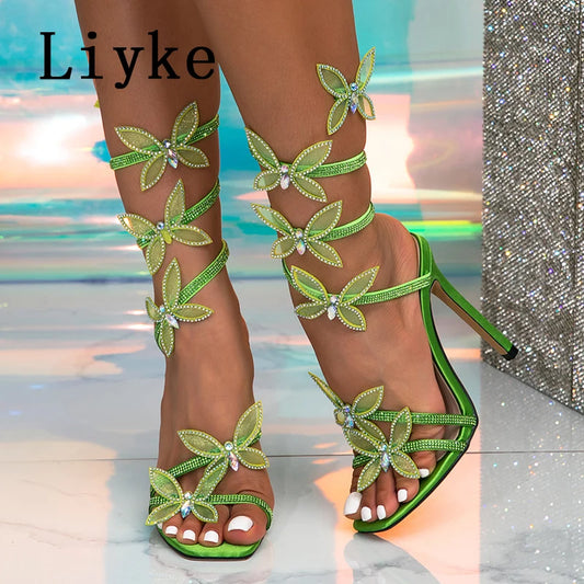 Women Sandals Crystal Butterfly Square Toe Wedding Party Stripper Shoes High Heels Black Blue