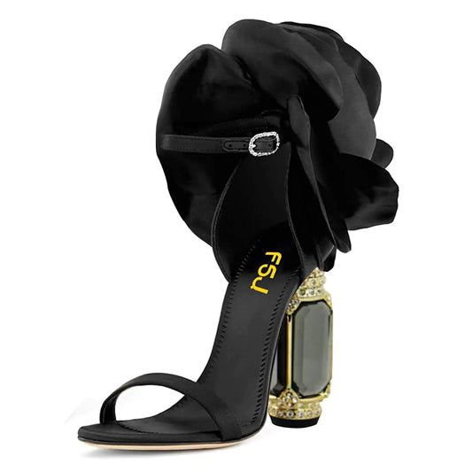 FSJ Women Flower Crystal Chunky Block High Heel Ankle Strap Sandals Open Toe Fashion Dress Evening Party Prom Shoes Size 8 Black Flower